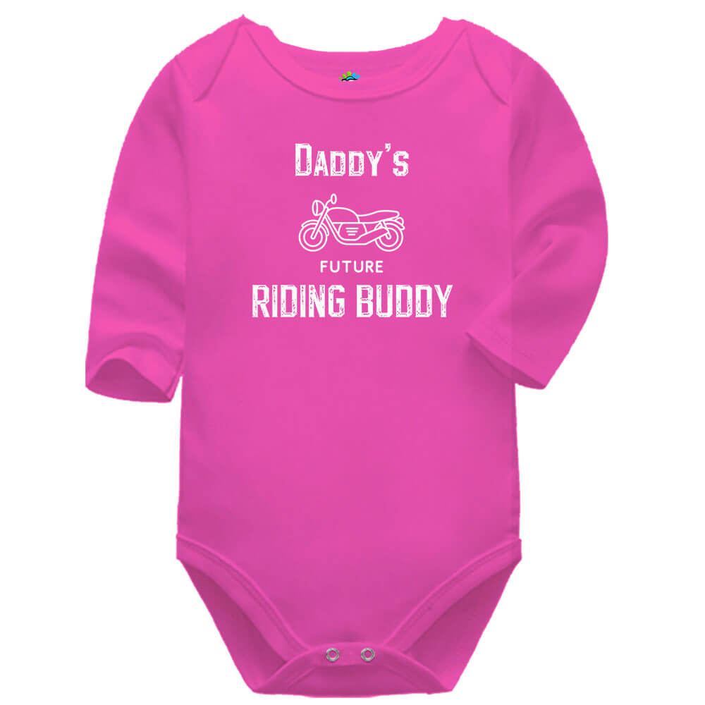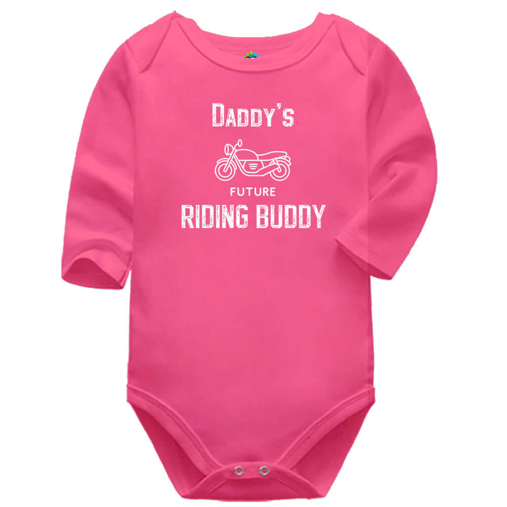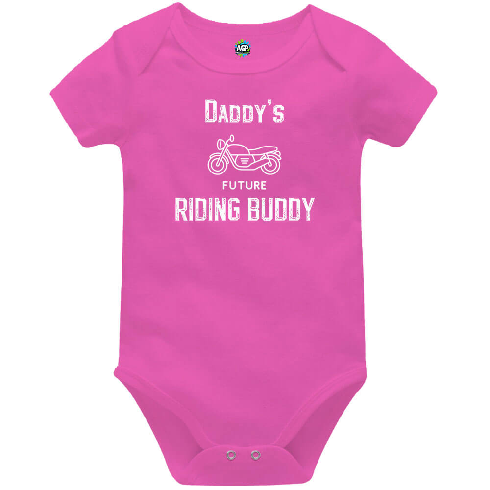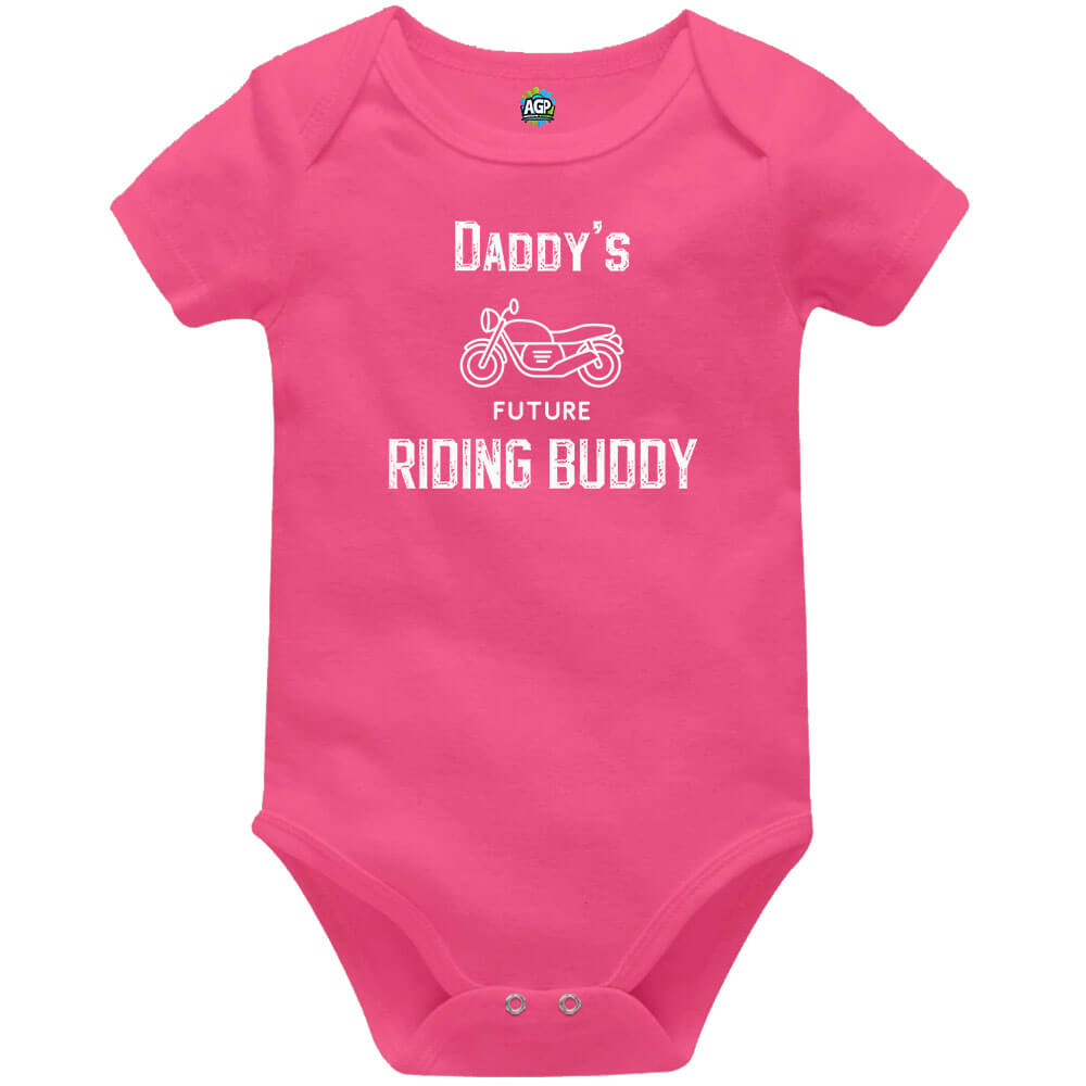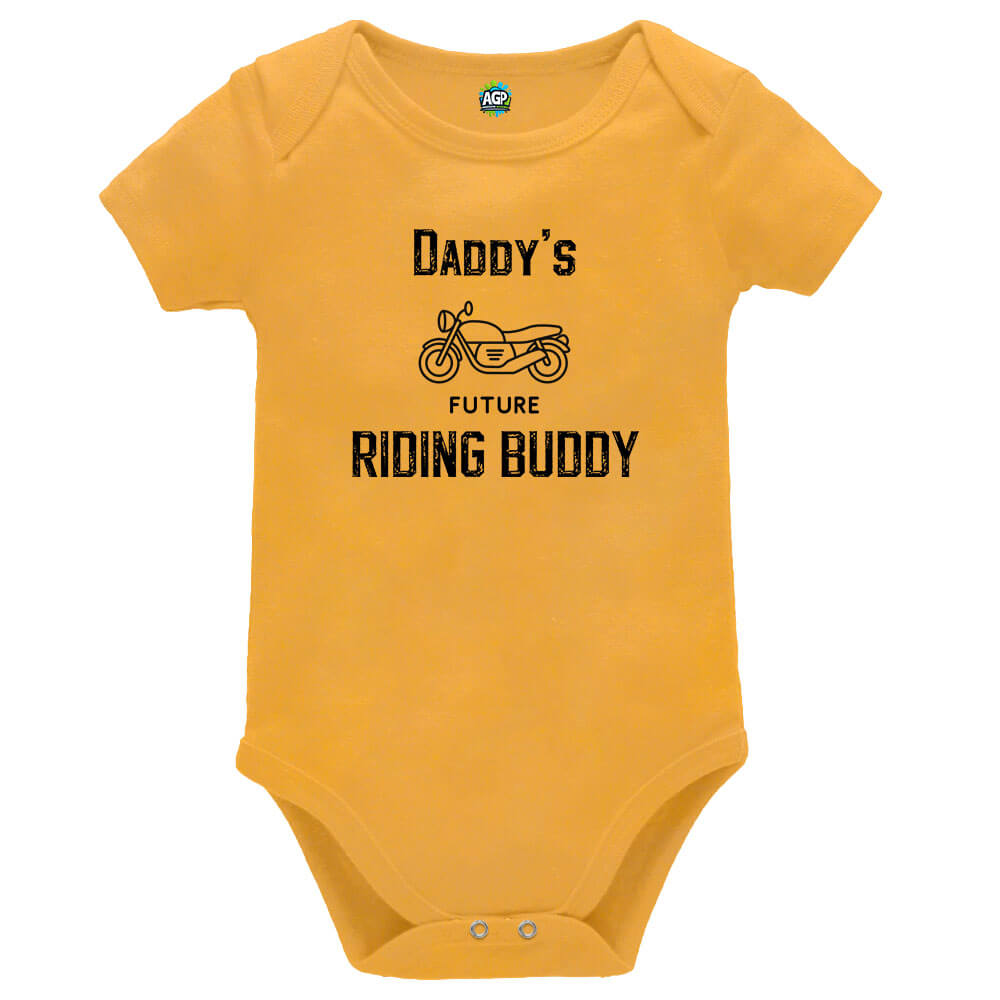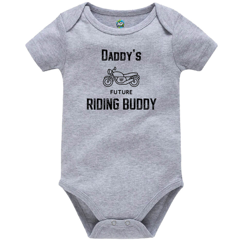 Showcasing the slogan “Dad’s Future Riding Buddy” in a bold, rugged font alongside a detailed motorcycle illustration, this baby vest adds a fun and meaningful touch to any outfit.