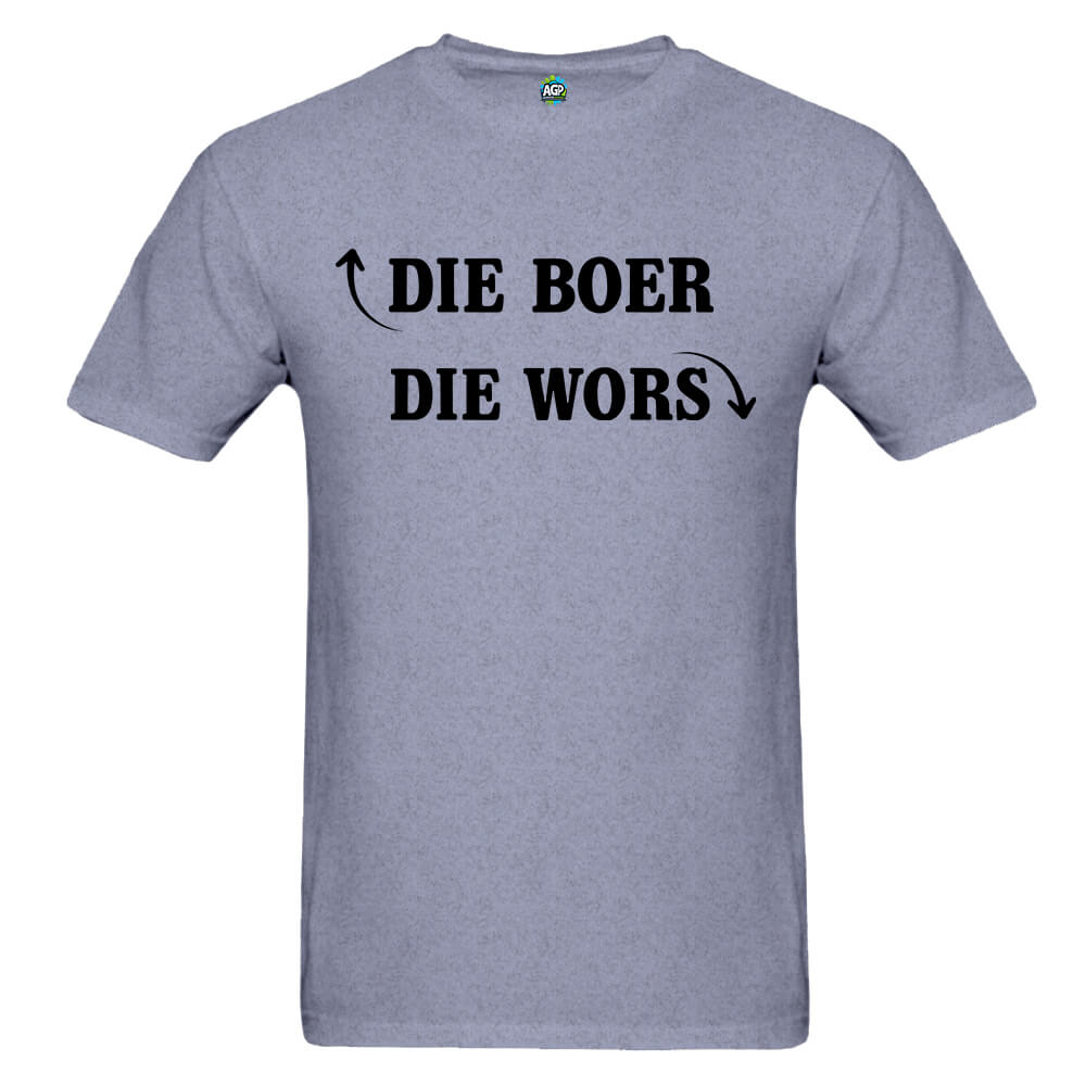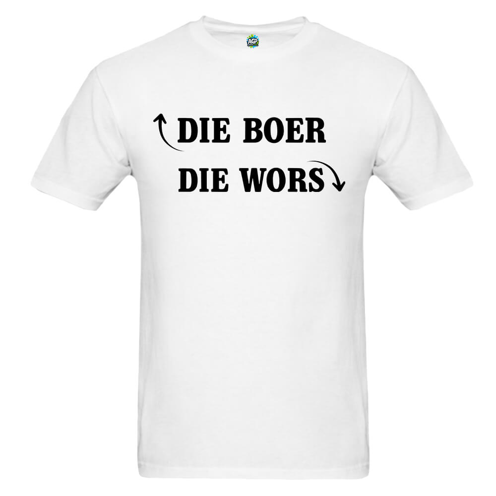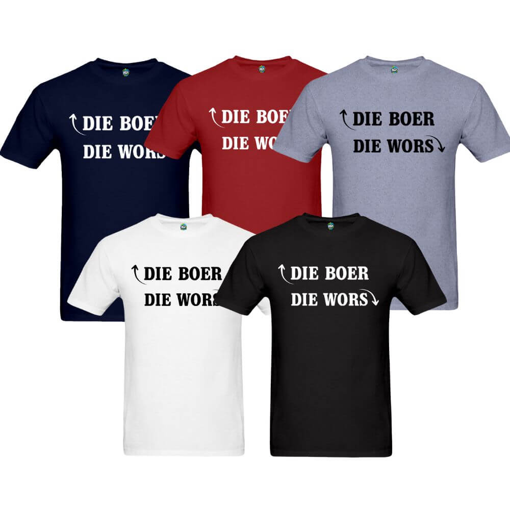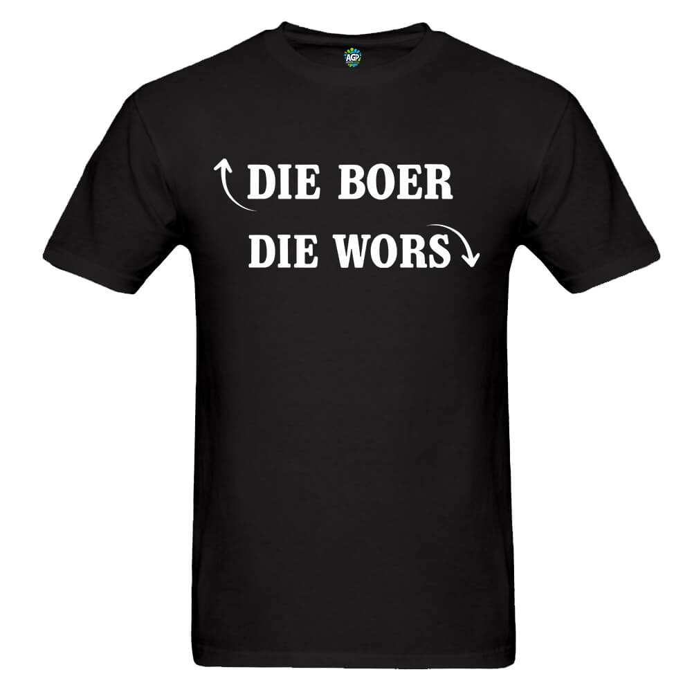 The “Die Boer” Afrikaans Adult T-Shirt brings a humorous twist to classic South African culture. Featuring the playful slogan “Die Boer” with an upward-pointing arrow and “Die Wors” with a downward-pointing arrow, this eye-catching design is sure to spark laughter and start conversations. Made from soft, high-quality fabric, it’s a comfortable and stylish way to show off your sense of humour and local pride.