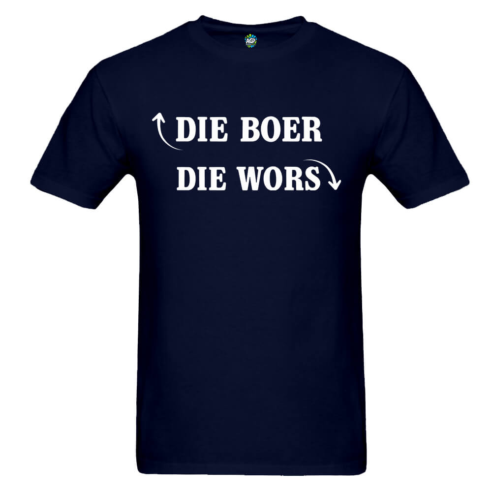 Features the witty “Die Boer” and “Die Wors” slogans with matching arrows, making it a light-hearted nod to South African humour and culture.