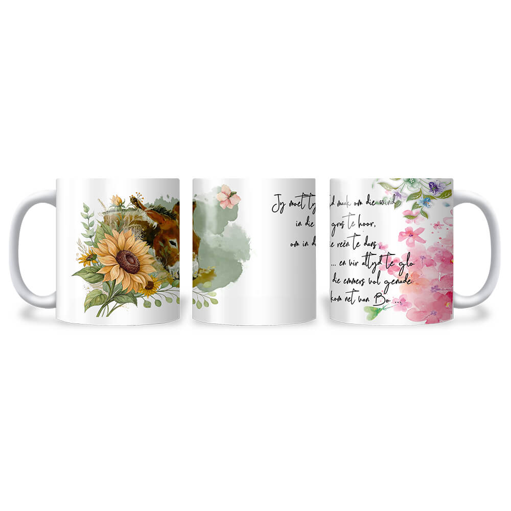 “Emmers Vol Genade” 330ml Afrikaans Mug combines meaningful Afrikaans inspiration with charming design, making it perfect for enjoying your favourite hot beverages. Featuring a heartfelt slogan alongside a delicate watercolour illustration of a donkey and sunflowers, this mug brings warmth and positivity to every sip. Crafted for daily use, it is an ideal gift for friends, family, or yourself.