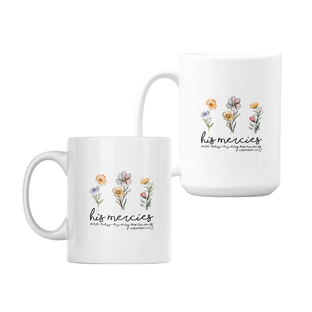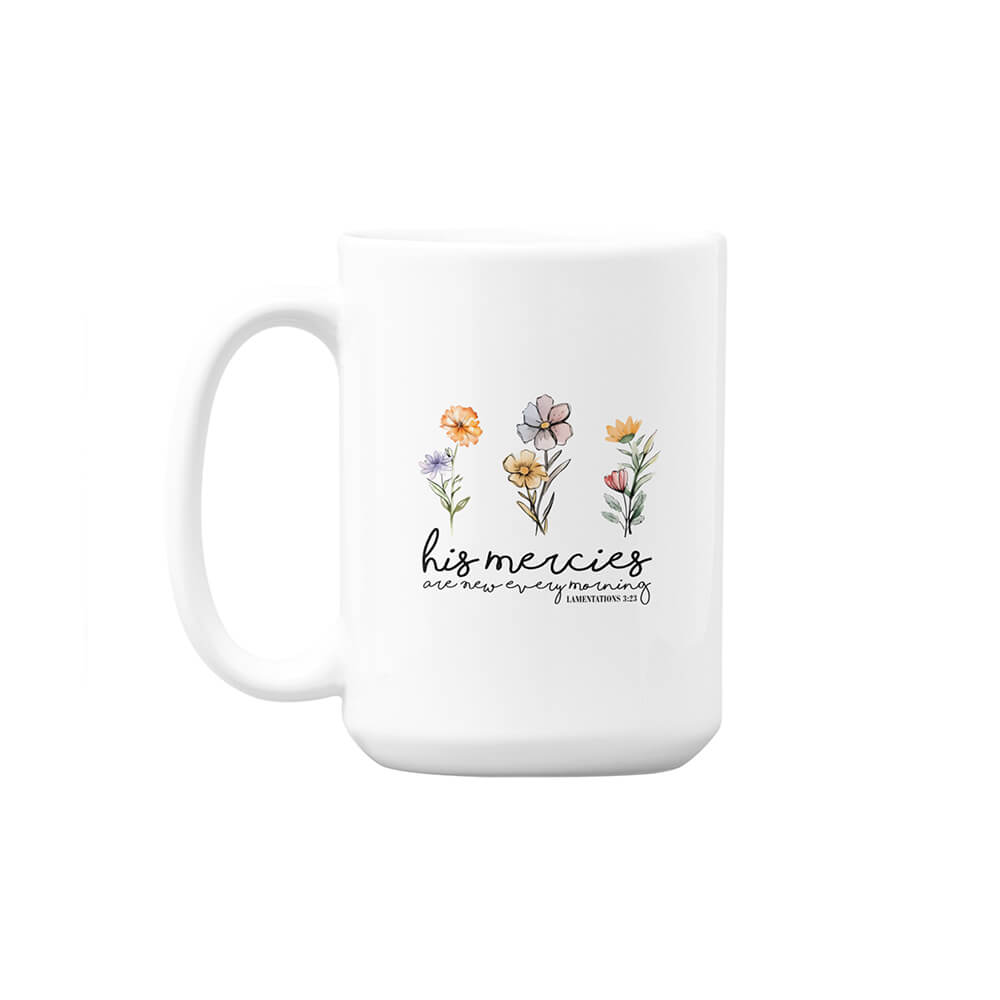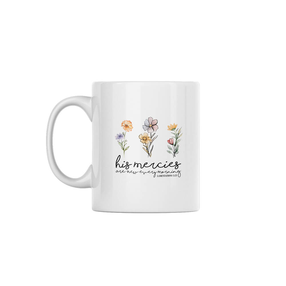 “His Mercies” Easter Mug is a beautifully designed ceramic mug featuring a delicate watercolour illustration of flowers and the uplifting scripture, “His Mercies Are New Every Morning – Lamentations 3:23”. Perfect for your morning tea or coffee, this mug serves as a daily reminder of faith, hope, and renewal.