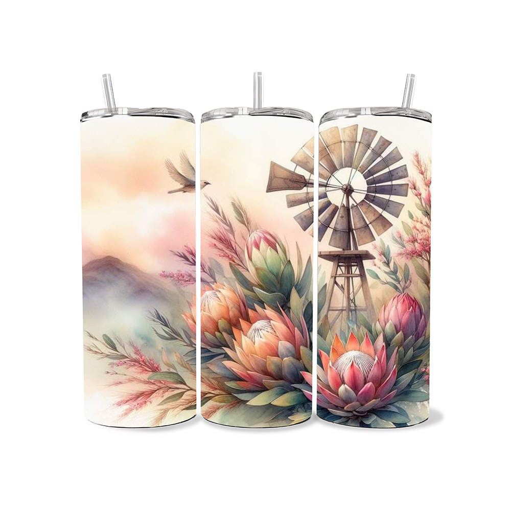 Crafted for both beauty and practicality, the “Rooted In Grace” Double Wall Stainless Steel Travel Tumbler 900ml features a delicate watercolour illustration of protea flowers nestled beside a rustic windmill. The gentle pastel background and soft, feminine tones evoke a sense of calm and grace, making this insulated tumbler a charming companion for daily hydration or thoughtful gifting.