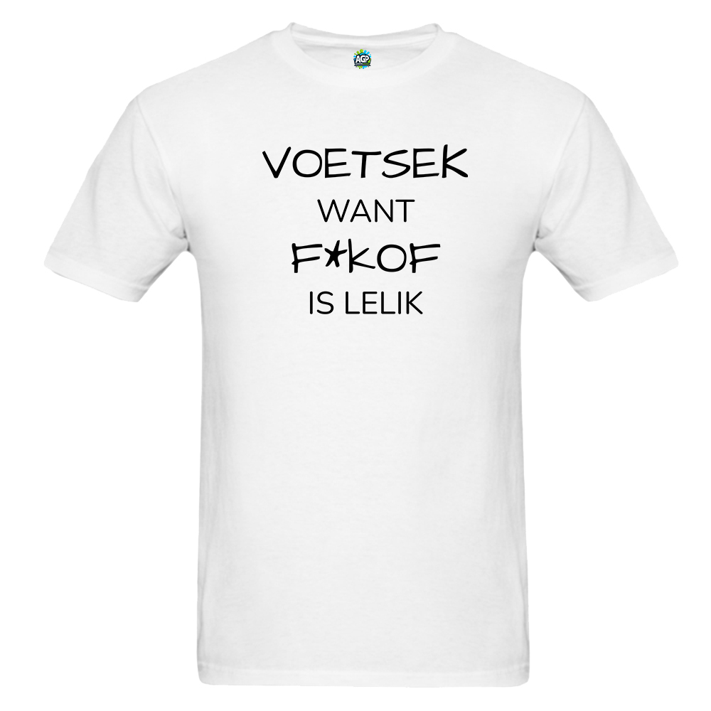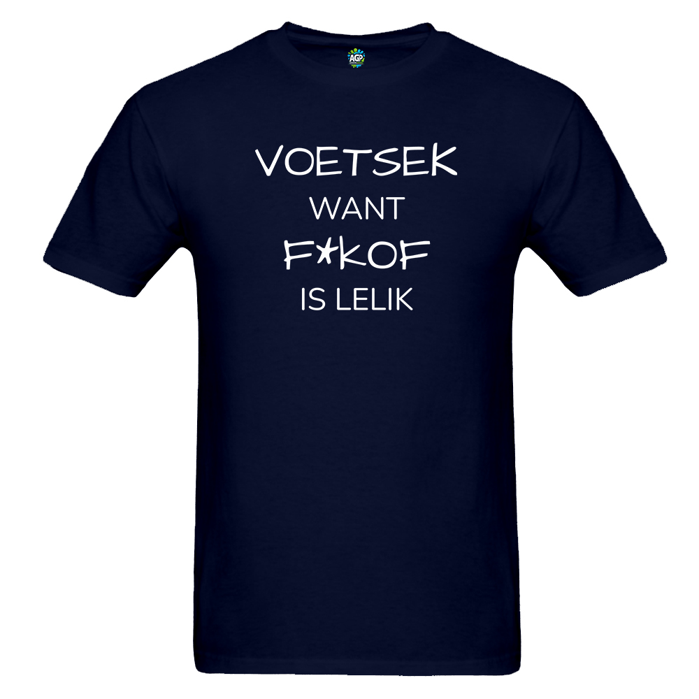 Features the well-known slogan “Voetsek Want F*kof Is Lelik”, bringing genuine South African humour to your wardrobe.